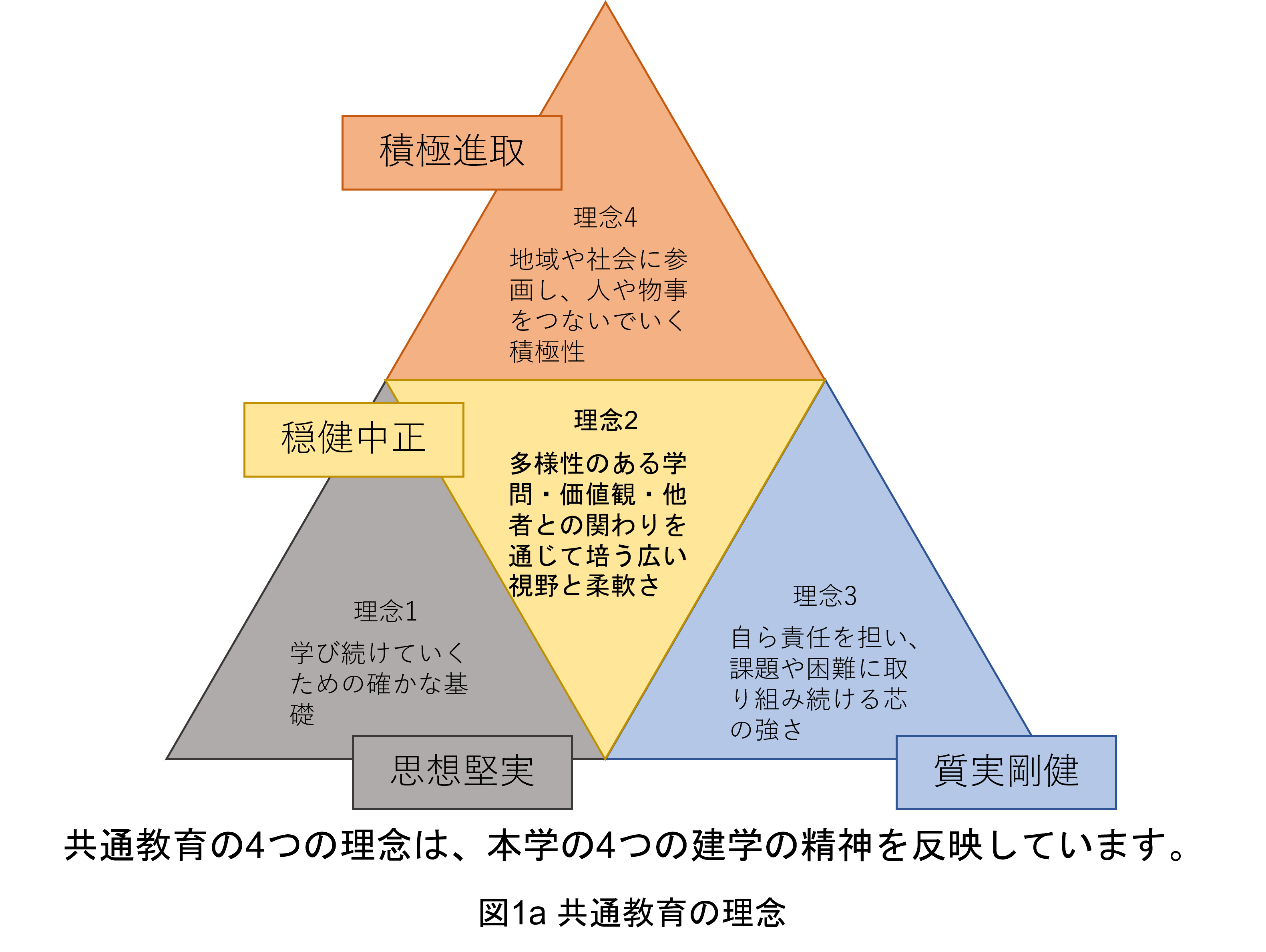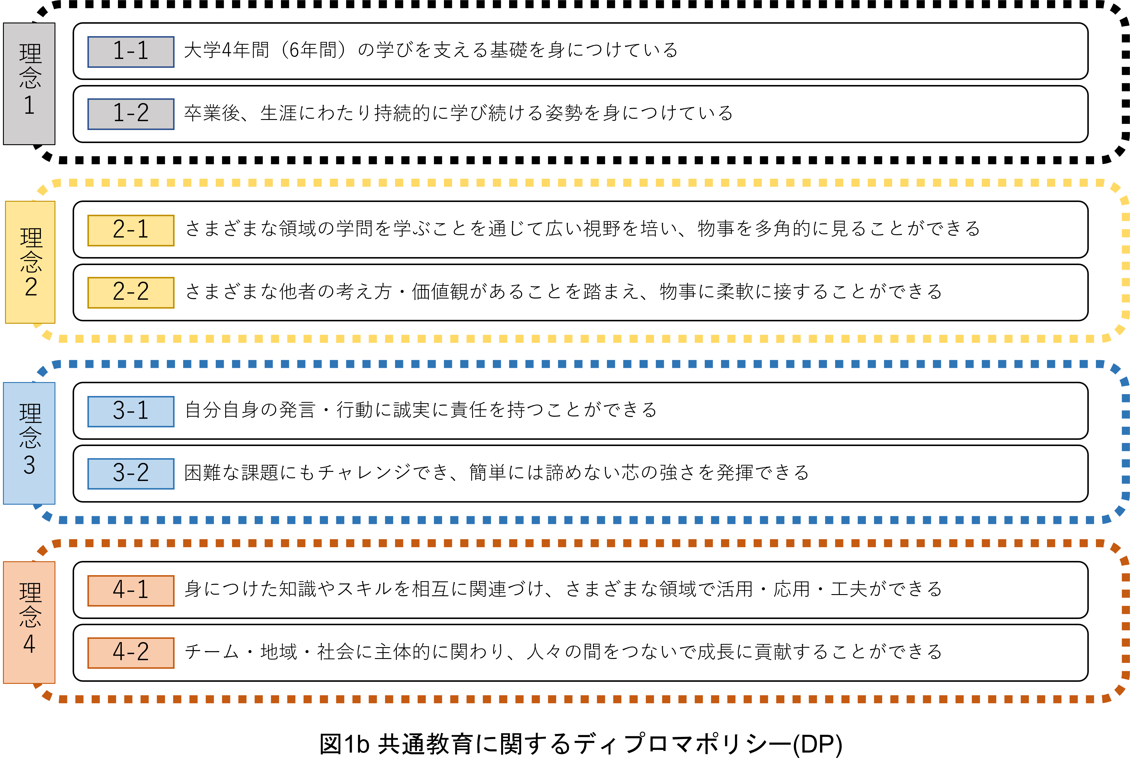 また、2023年度から、すべての学位(教育)プログラムにおいて、共通教育に関するDPが学位(教育)プログラムのDPとして取り入れられることになり(専門科目のDPと併置)、共通教育科目は新しいDPのもとで開講されることになりました。新しく制定された共通教育に関するDPは、身につける能力(知識・理解、技能、態度・志向性)の観点から作成されており、共通教育の4つの理念(図1a)とそれに対応する8つディプロマ・ポリシーの項目(図1b)から成っています(1つの理念に対して2つのDPが対応)。